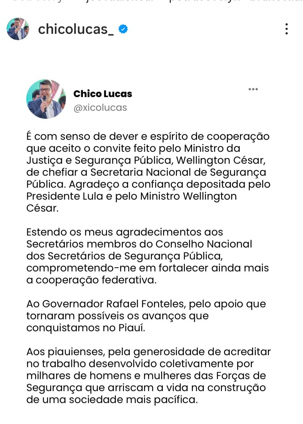Nesta quarta-feira (21) o ministro da Justiça, Wellington Lima e Silva, anunciou o nome do secretário estadual de Segurança Pública, Chico Lucas, para a Secretaria Nacional de Segurança Pública. O nome de Chico Lucas chegou a ser cotado para o cargo de ministro. O Conselho dos Secretários de Segurança do Brasil apresentaram uma carta defendendo Chico Lucas para o Ministério da Justiça. Na terça-feira, o ministro Wellington Lima e Silva se reuniu com Chico Lucas tratando sobre a nova missão do secretário estadual de Segurança Pública. Chico Lucas aguarda a publicação da nomeação no Diário Oficial.