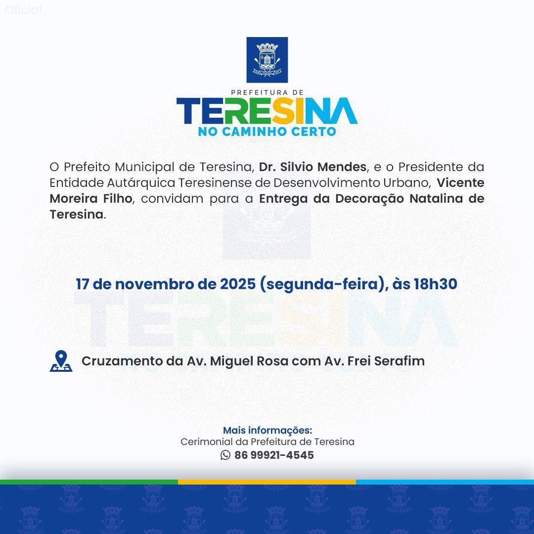 O prefeito de Teresina Sílvio Mendes entrega, nesta segunda-feira (17), a Decoração Natalina da capital. A solenidade acontece no cruzamento das avenidas Miguel Rosa com a Frei Serafim, a partir das 18h30.