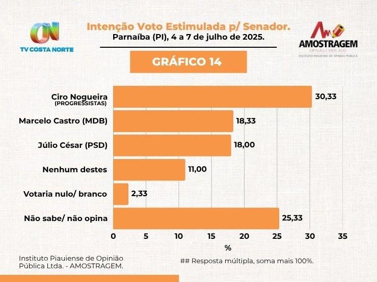 Pesquisa encomendada junto ao Instituto Amostragem, tendo sido realizada entre os dias 4 e 7 de julho de 2025, ouvindo 300 eleitores de Parnaíba, mostra que, se a eleição fosse hoje, o senador Ciro Nogueira (Progressistas) lideraria com folga as intenções de votos em todos os cenários.