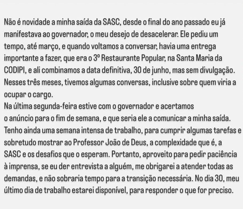 Ao comunicar a mudança, o governador agradeceu e destacou o trabalho realizado por Regina Sousa à frente da Sasc. “Ela irá se dedicar mais a sua saúde, mas continuará firme na luta em prol dos que mais precisam, como sempre fez em todas as missões que exerceu”, publicou Rafael Fonteles em suas redes sociais.