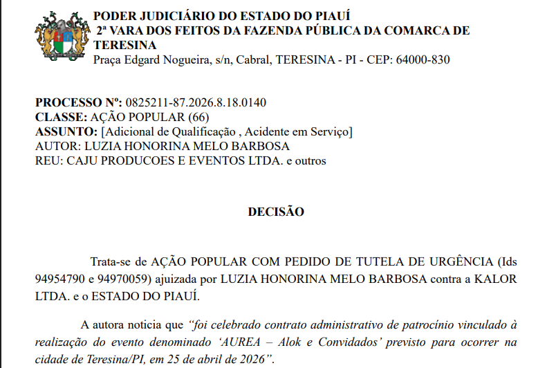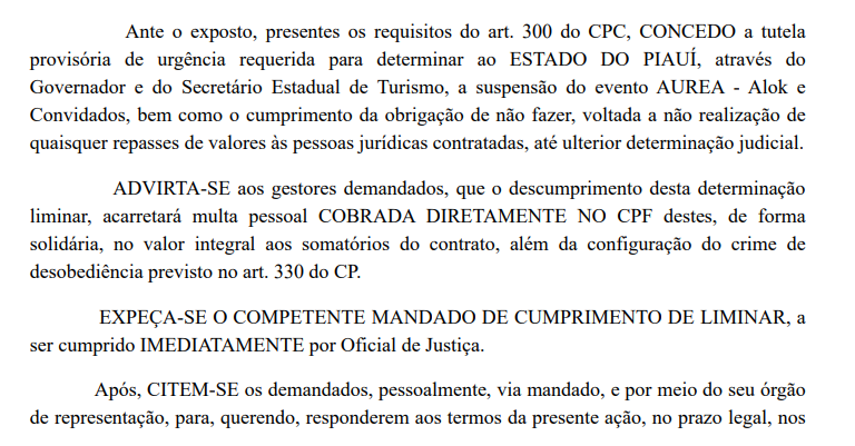 O juiz da 2ª Vara dos Feitos da Fazenda Pública da Comarca de Teresina, Litelton Vieira de Oliveira, suspendeu a realização do show AUREA – Alok e Convidados, que tem a apresentação do Banco do Brasil e patrocínio de empresas privadas e do Governo do Estado do Piauí. O show do DJ Alok, estava marcado para às 21h deste sábado (25), na . A decisão, proferida nesta sexta-feira (24), acolhe pedido de tutela de urgência em uma ação popular, em que foi solicitada a suspensão do contrato firmado para apresentação do artista, assim como qualquer pagamento decorrente da contratação e outras despesas vinculadas ao evento.