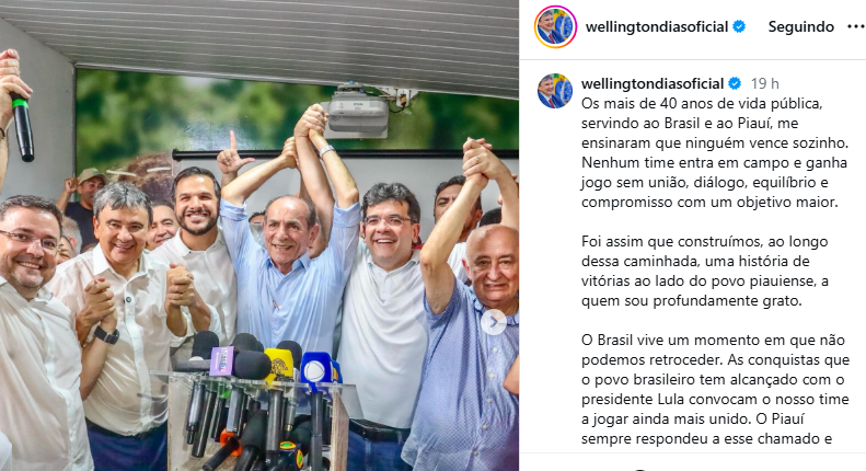 Wellington Dias postou nas redes sociais, uma mensagem de agredecimeneto. "Os mais de 40 anos de vida pública, servindo ao Brasil e ao Piauí, me ensinaram que ninguém vence sozinho. Nenhum time entra em campo e ganha jogo sem união, diálogo, equilíbrio e compromisso com um objetivo maior", publicou o senador.